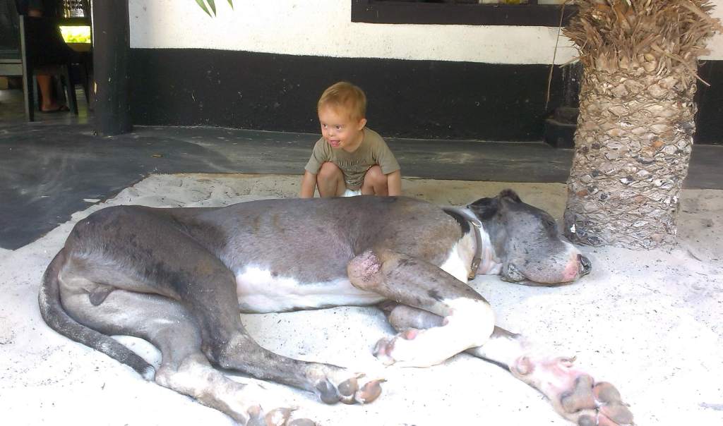 Als er wieder raus musste, war richtig Kampfstimmung. Ich hab ihn fast nicht gebändigt bekommen, so hat er sich gewehrt. Anziehen unter diesen Bedingungen ist kein Zuckerschlecken. Aber irgendwann war auch das geschafft und zum Glück kamen bald darauf auch ein paar der Kinder raus. Damit hatte er Gesellschaft im Sand und war wieder glücklich. Außerdem fand er den großen Hund äußerst interessant. Dieser wiederum war relativ unbeeindruckt und lag die meiste Zeit ganz entspannt auf dem Boden.