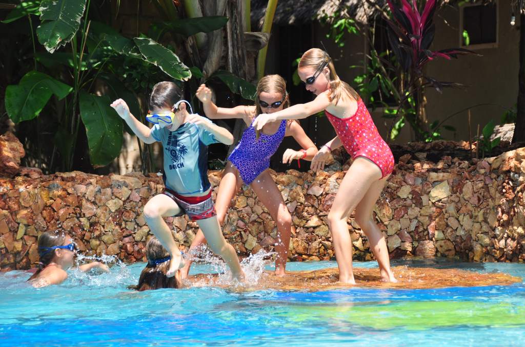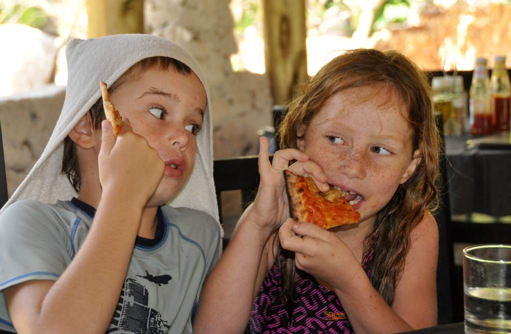 Am Pool war nichts los und auch sonst schienen kaum Leute unterwegs zu sein in diesem Hotel. Also haben wir uns hemmungslos ausgebreitet und die Kinder sind ohne zu zögern ins Wasser gesprungen. Immerhin war Josia anfangs noch vom Sand und den Spielsachen angetan. Irgendwann hat aber auch er den Pool entdeckt, und ab da ging der Kampf los. Ich weiß nicht, wie oft ich ihn im Laufe des Tages eingefangen habe. Ein paar Mal genau in dem Augenblick, als er das erste Bein ins Wasser setzen wollte!