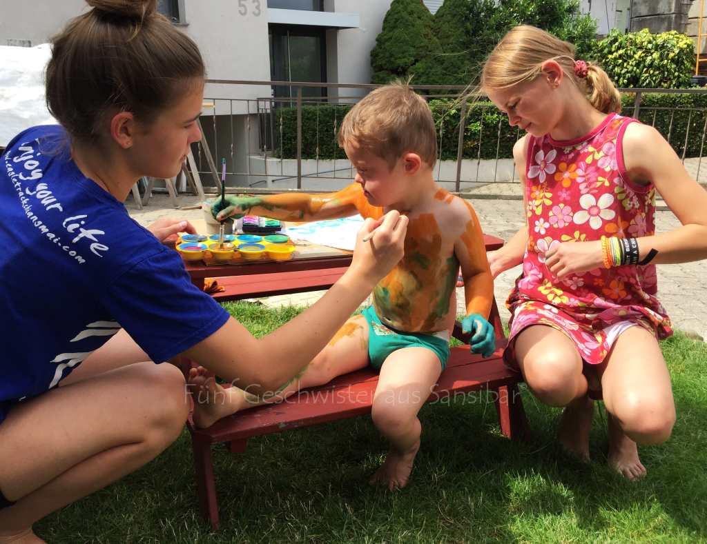 Und als Josia so am Malen war, ist den Mädels eingefallen, dass wir sie vor vielen Jahren ja auch mal mit Wasserfarben bemalt hatten. Und so war die Idee geboren, Josia in einen Tiger zu verwandeln.