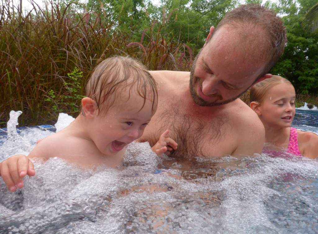 An einem dieser extrem feuchten Tage haben wir uns den Spa-Bereich etwas genauer angeschaut. Da außer uns niemand dort war, sind wir gemeinsam in die Sauna und Dampfgrotte und haben anschließend die schöne Abkühlung im Sprudelbad genossen. Da hat uns der leichte Regen von oben wenig gestört.