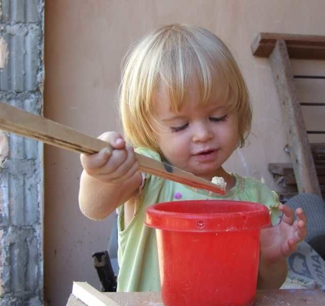 Beim Bau der Küche haben die Mädels viel geholfen. Vor allem die Sägespäne hatten es ihnen angetan und sie haben ganz ausgiebig damit gekocht.