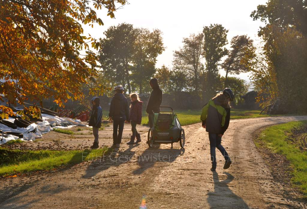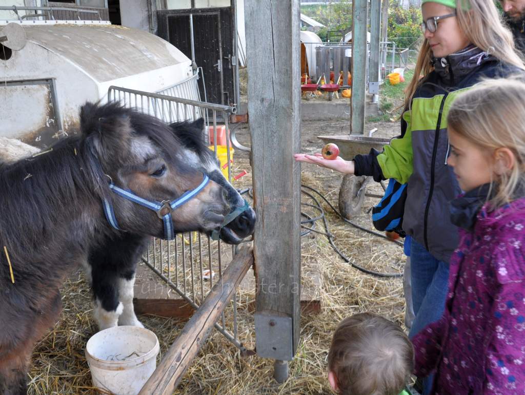 Nach dem leckeren Kuchen sind wir eine Runde über den Hof geschlendert, um einen Blick auf all die Tiere zu werfen, und anschließend noch ums halbe Dorf gewandert. Da das Dorf eine sehr überschaubare Größe hat, geht das relativ schnell. Unterwegs haben wir das Fallobst gekostet – die Kinder fanden es allesamt sehr lecker! Und zum Abend hin ist ein Teil der Kinder mit in den Stall, um beim Füttern der Kühe zu helfen.