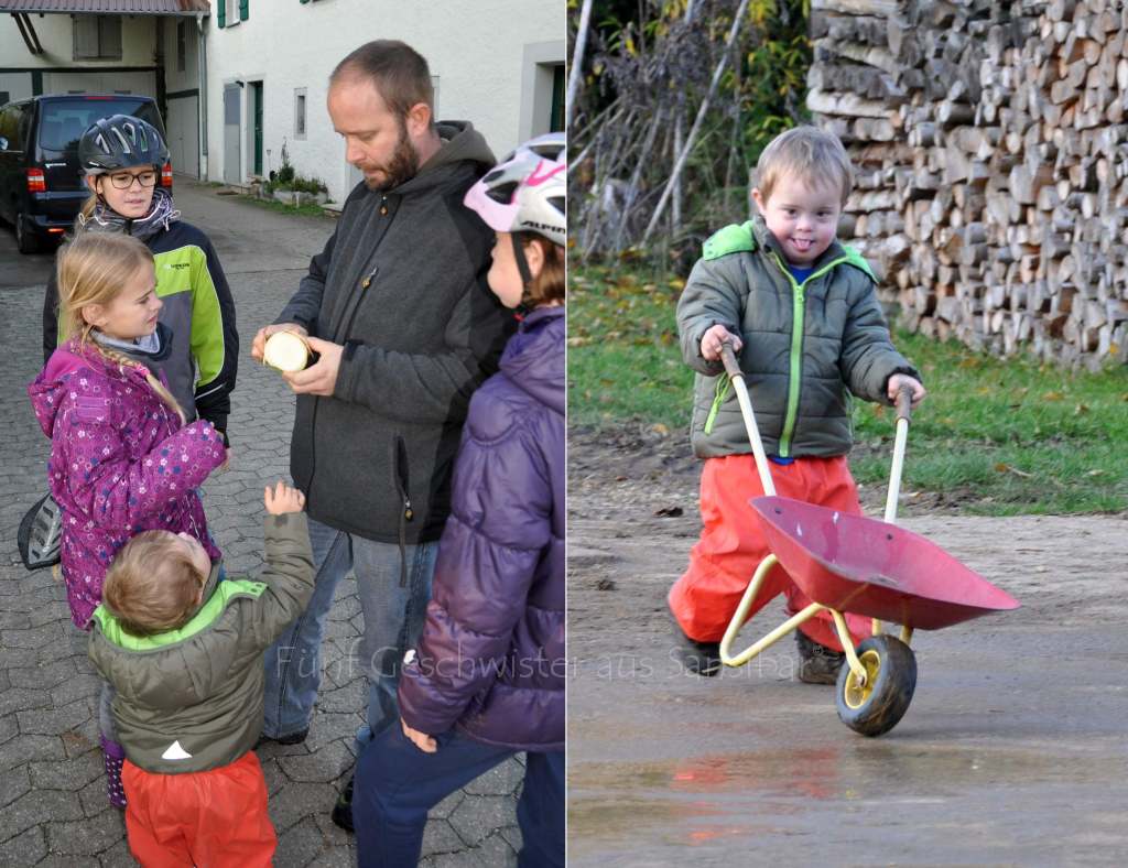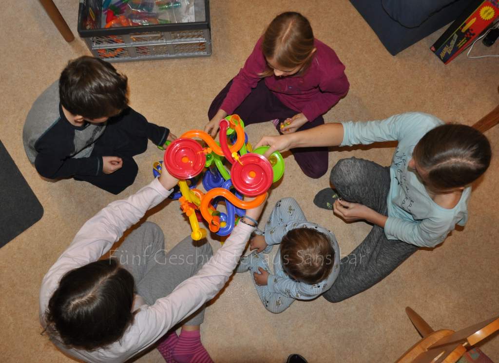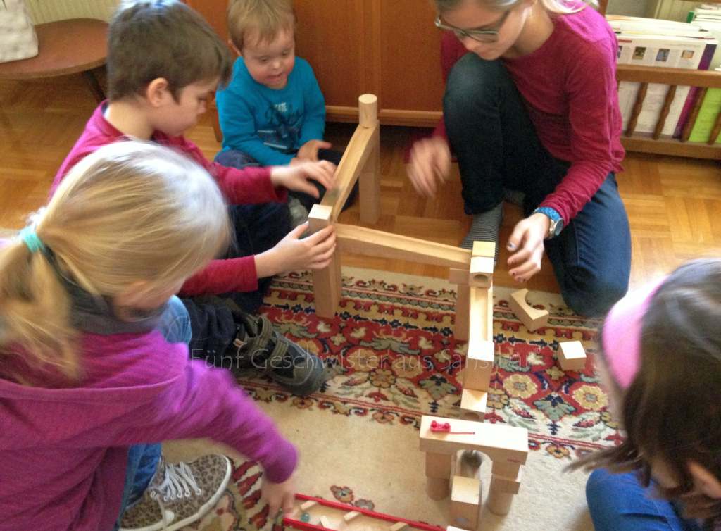 Am Samstag haben wir uns auf den Weg gemacht und sind pünktlich zu Kaffee und Kuchen auf dem Bauernhof eingetroffen. HaDis Tante hatte leckeren Kuchen für uns gebacken, den wir gemeinsam in ihrem Wohnzimmer genossen haben. Da Kinder es meist nicht sehr lange am Tisch aushalten, kam die Holzkugelbahn sehr gelegen. Es wurde tüchtig gebaut und gekugelt, auch wenn Josia in regelmäßigen Abständen alles wieder zum Einsturz brachte. Natürlich sehr zum Missfallen seiner vier Geschwister!