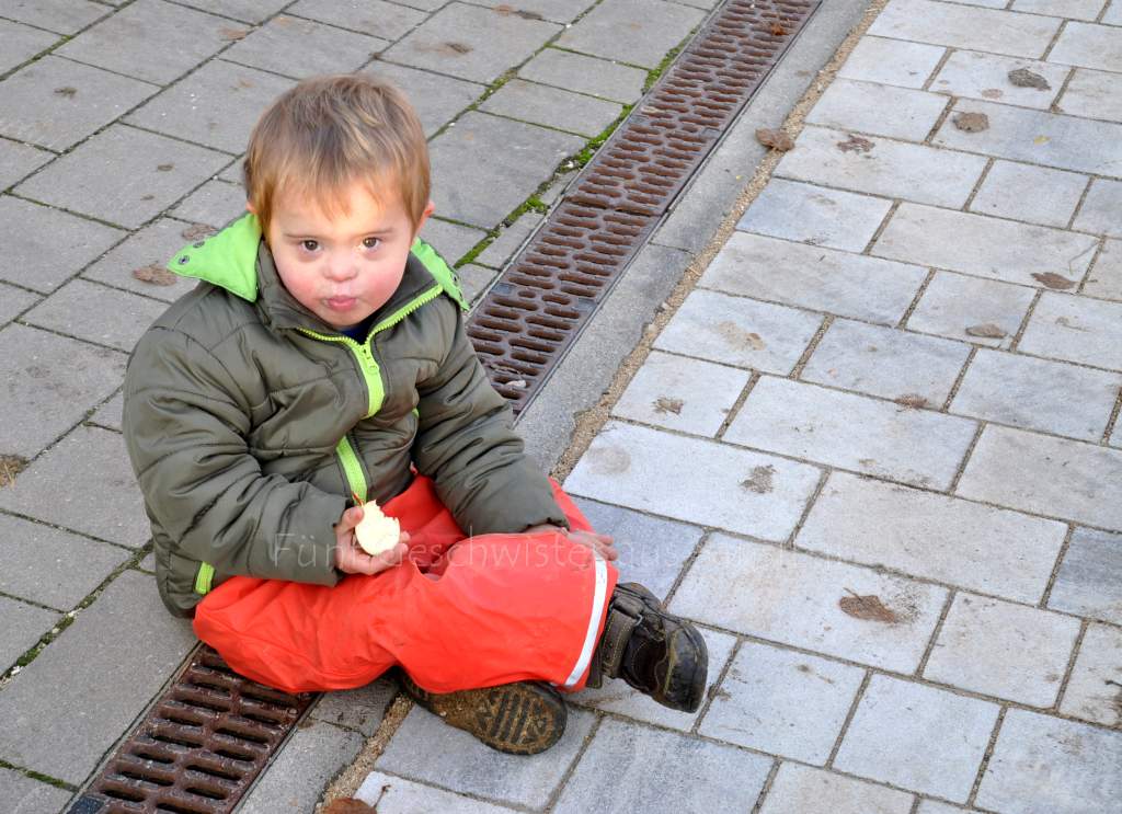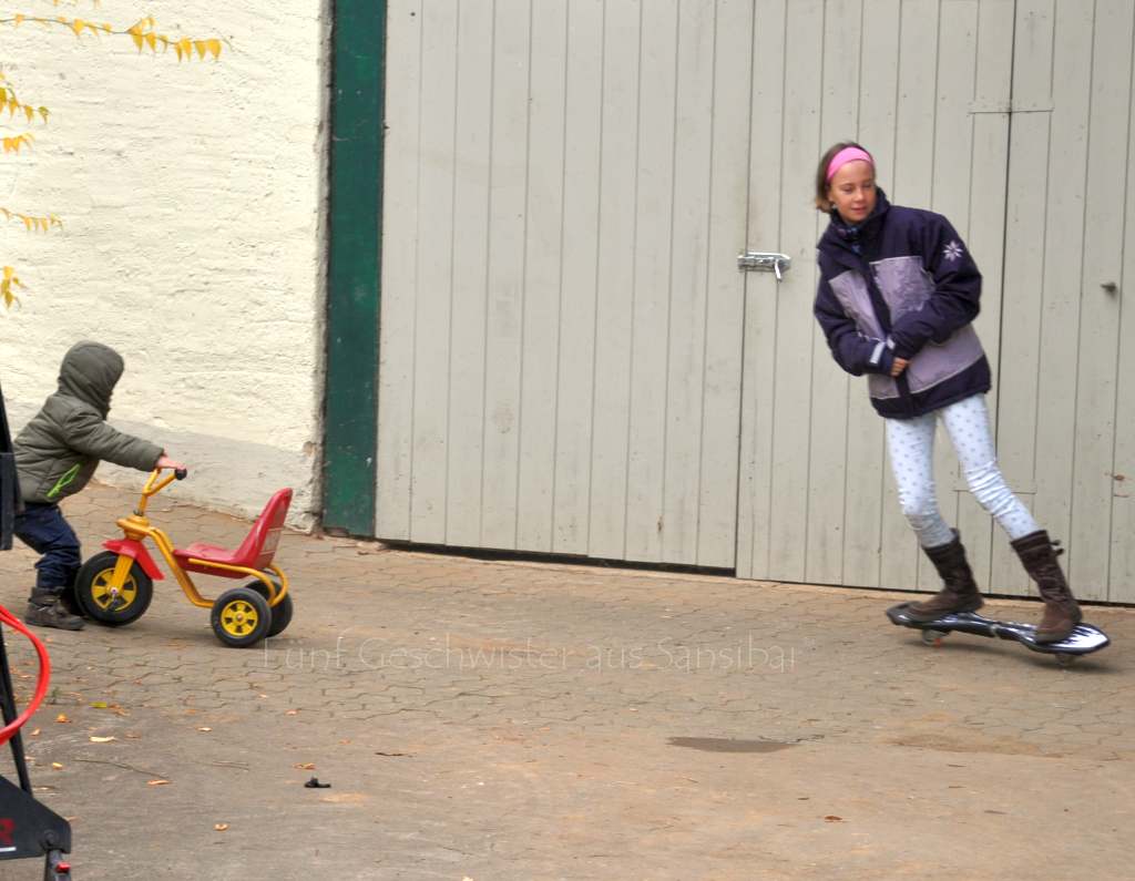 Wenn es trocken und nicht zu kalt war, sind die Kinder gerne nach draußen in den Hof zum Spielen. Die Großen waren häufig mit ihren Waveboards unterwegs, für Josia hatten wir unser Bobby dabei, aber es gab auch etliche Fahrzeuge vor Ort. Leider hat sich Joel mit dem kleinen Dreirad ziemlich dumm verdreht und ist bei seiner Abfahrt ungebremst auf dem Gesicht gelandet. Das war im ersten Moment ein riesen Schreck!