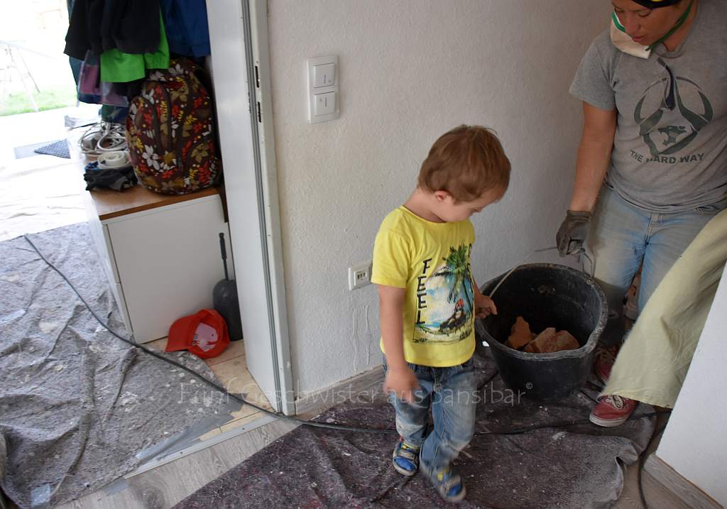 Direkt nach dem Mittagessen wurde der Hauptwasserhahn zugedreht, da Sammy an einzelnen Leitungen neue Abstellhähne und Zählerstellen einbauen wollte. Die Küche musste also erst mal ihrem Dreck überlassen bleiben und ich habe stattdessen mit Josia Spiele gespielt. Von langer Dauer war das allerdings nicht, weil es ihm dann bald schon zu laut wurde. Es macht aber auch enorm viel Krach, dieser Abbruchhammer!
