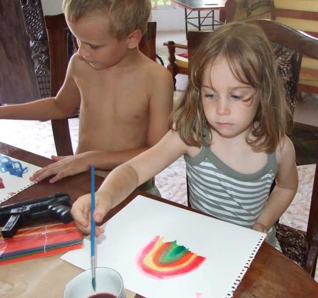 Am 1. Juni wird in Polen der Kindertag gefeiert. Das weiß ich auch erst seit kurzem, da wir von Nasyas Schulfreund genau zu diesem Anlass eingeladen wurden. Wir gehen auch sonst immer mal wieder auf einen Besuch zu Kaitek und seiner Mutter, da sich die Kinder gut verstehen und gerne zusammen spielen. Am Montag gab es zur Feier des Tages Apfelkuchen, Kekse, smartie-artige Süßigkeiten und ein wenig Spiel und Spaß. Sie haben zusammen Wasserfarben gemalt und als Belohnung bekam jeder Seifenblasen.
