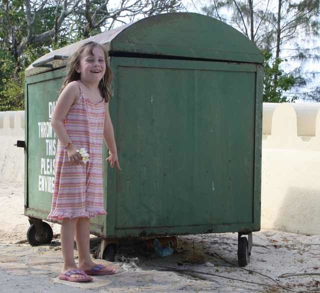 Nasya amüsiert sich, da dieser schöne, große Müllcontainer nicht wirklich seinen Zweck erfüllt – der Boden war durchgerostet!
